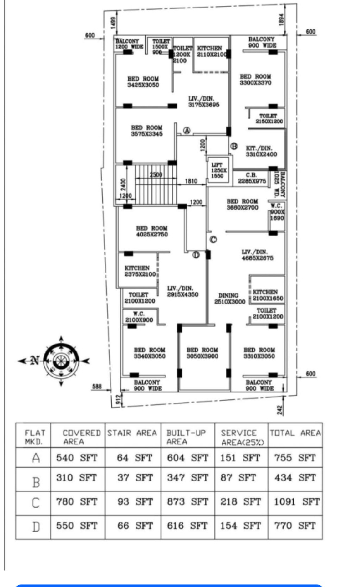 3BHK (1100 Sqft.), 2BHK (775 Sqft.), 1BHK (450 Sqft.) Approx. Superbuilt Area. Covered car Parking available. Building - G+5.